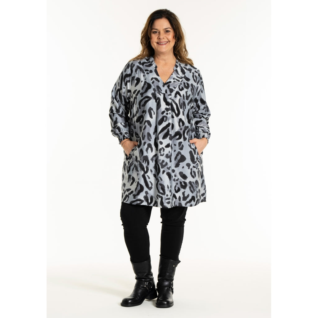 Stylish dress with gray leopard print made of viscose and nylon. The style features a V-neck with wide tape detail and long sleeves with wide smock cuffs.