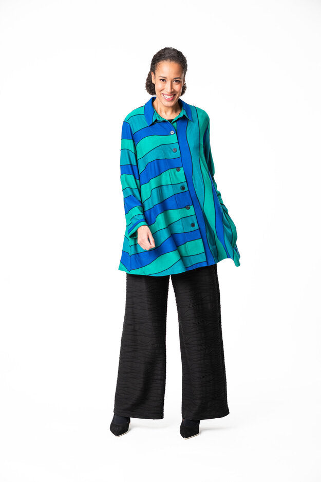 Nita is a casual, A-line shirt/jacket with buttons. The jacket has long sleeves, a nice collar and side pockets. The material is a soft, thin viscose tricot.