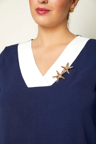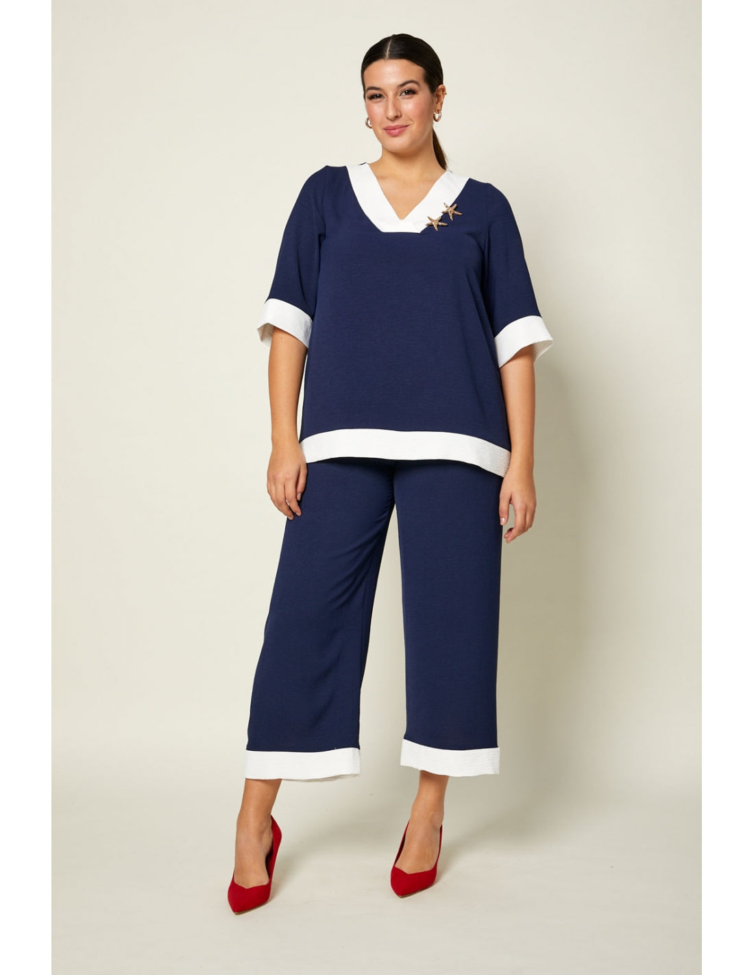 Bicolour party set with a loose blouse featuring a removable brooch and cropped trousers with elasticated waistband.