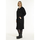 Raw black dress with round neckline and long sleeves in nylon-cotton mix. The design features a loose and comfortable fit with decorative patch pockets in contrasting structure and look.